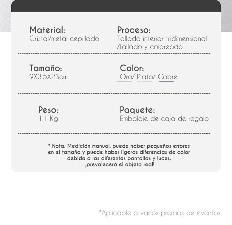 Este trofeo cuenta con una base metálica y una elegante pieza de cristal grabado personalizable. La base está hecha de metal resistente y duradero, mientras que el cristal transparente permite una vista clara y nítida del grabado personalizado. Este trofeo es perfecto para premiar logros deportivos, académicos o de negocios, y su diseño clásico lo hace ideal para cualquier tipo de ocasión. Con su combinación de materiales de alta calidad y grabado personalizado, este trofeo es una excelente forma de reconocer y celebrar el éxito.